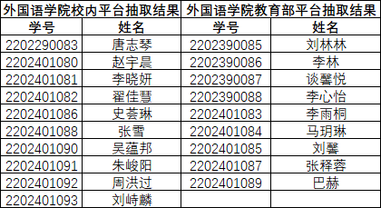 2026年外国语学院共有19名专业硕士研究生通过了学位论文学术不端检测并申请论文送审。根据《东北电力大学研究生学位论文评审管理办法(2025年修订)》文件要求,在学校研究生院工作人员、外国语学院分管研究生工作副院长、学院纪检委员、研究生代表四方共同监督下,采用学校研究生学位论文送审抽签工具随机抽取,现将抽签结果公示如下: