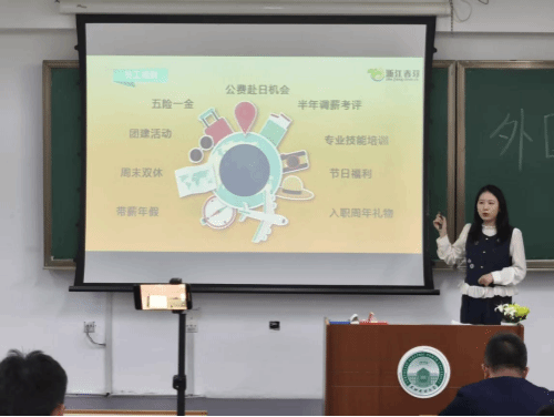报告会后,浙江春芽学成教育科技有限公司开展招聘宣讲,作为杭州日报报业集团旗下华媒控股重点孵化的教育企业,其深耕国际教育领域二十余年,以日语教学与留学服务为核心,整合日本高校资源已与江浙十余所学校合作打造国际化办学项目、在读学生千余人。本次面向日语和英语专业学生开放“交流中心管培生”“留学顾问助理””国际课程运营专员“等岗位,将为入职者提供系统培训、导师带教及清晰晋升通道,传递“以长期培养助力人才成长”的招聘理念,现场与学生互动答疑,气氛热烈。