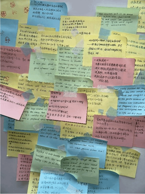 转至“创意续写·电影片段续编”的静谧角落,参与者们沉浸在《楚门的世界》(The Truman Show)、《死亡诗社》(Dead Poets Society)等经典影片的片段中,随即在便利贴上写下脑洞大开的续写内容。随着彩色便签贴满展示墙,一部由集体智慧创作的“平行时空故事集”逐渐成型,吸引众多师生驻足阅读甚至参与续写。这一环节通过“文本再创作”,引导学生在语言实践中融入个人思考,同时提升了写作与想象力。
