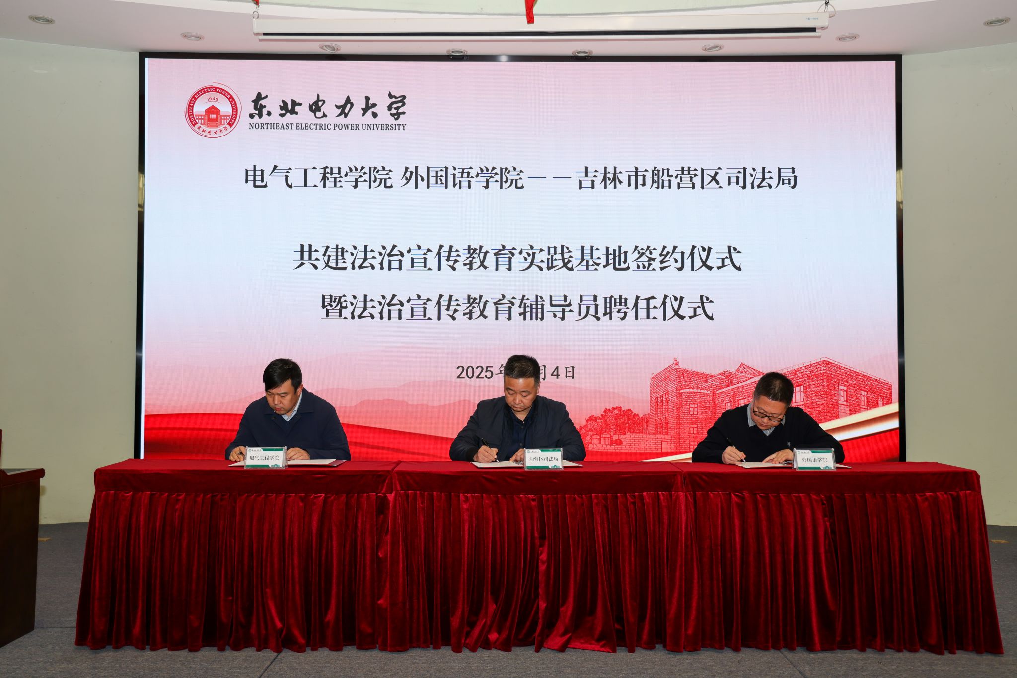 为深入学习贯彻习近平法治思想,加强校地合作,共同推进大学生法治宣传教育工作,提升大学生法治素养,2025年12月4日“国家宪法日”到来之际,外国语学院党委、电气工程学院党委与吉林市船营区司法局在东北电力大学学术中心隆重举行法治宣传教育实践基地共建签约仪式暨法治宣传教育辅导员聘任仪式。外国语学院党委书记王雷、院长赵冠宇、电气工程学院院长王鹤、船营区司法局局长王瑛琪、吉林东坤律师事务所主任曹志刚、电气工程学院与外国语学院师生代表等200余人参加了此次活动。仪式由外国语学院党委副书记杜伟主持。