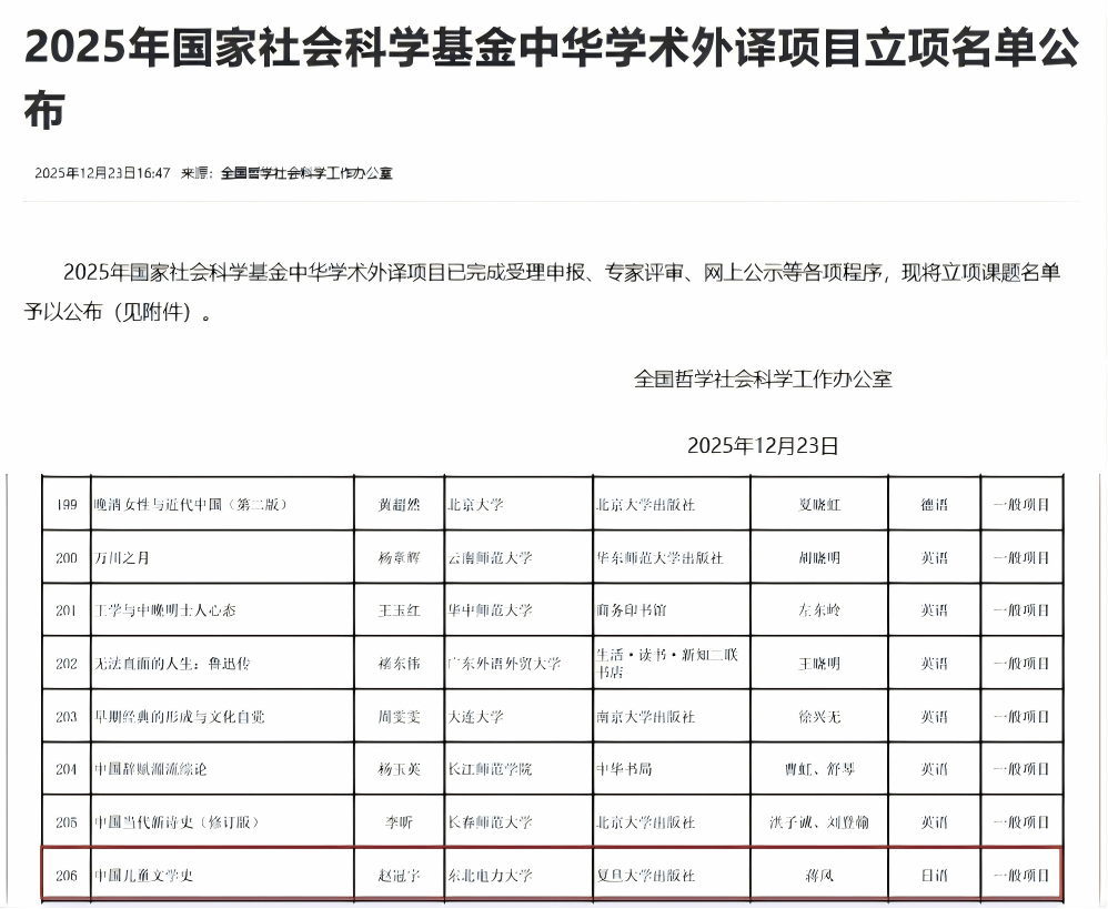 12月23日全国哲学社会科学工作办公室公布了2025年国家社科基金中华学术外译项目立项名单,外国语学院院长赵冠宇申报的《中国儿童文学史》(日文版)获批立项,实现了我校该项目获批的历史性突破,标志着外国语学院在哲学社会科学研究成果的国际传播和学术外译领域取得了重要进展。