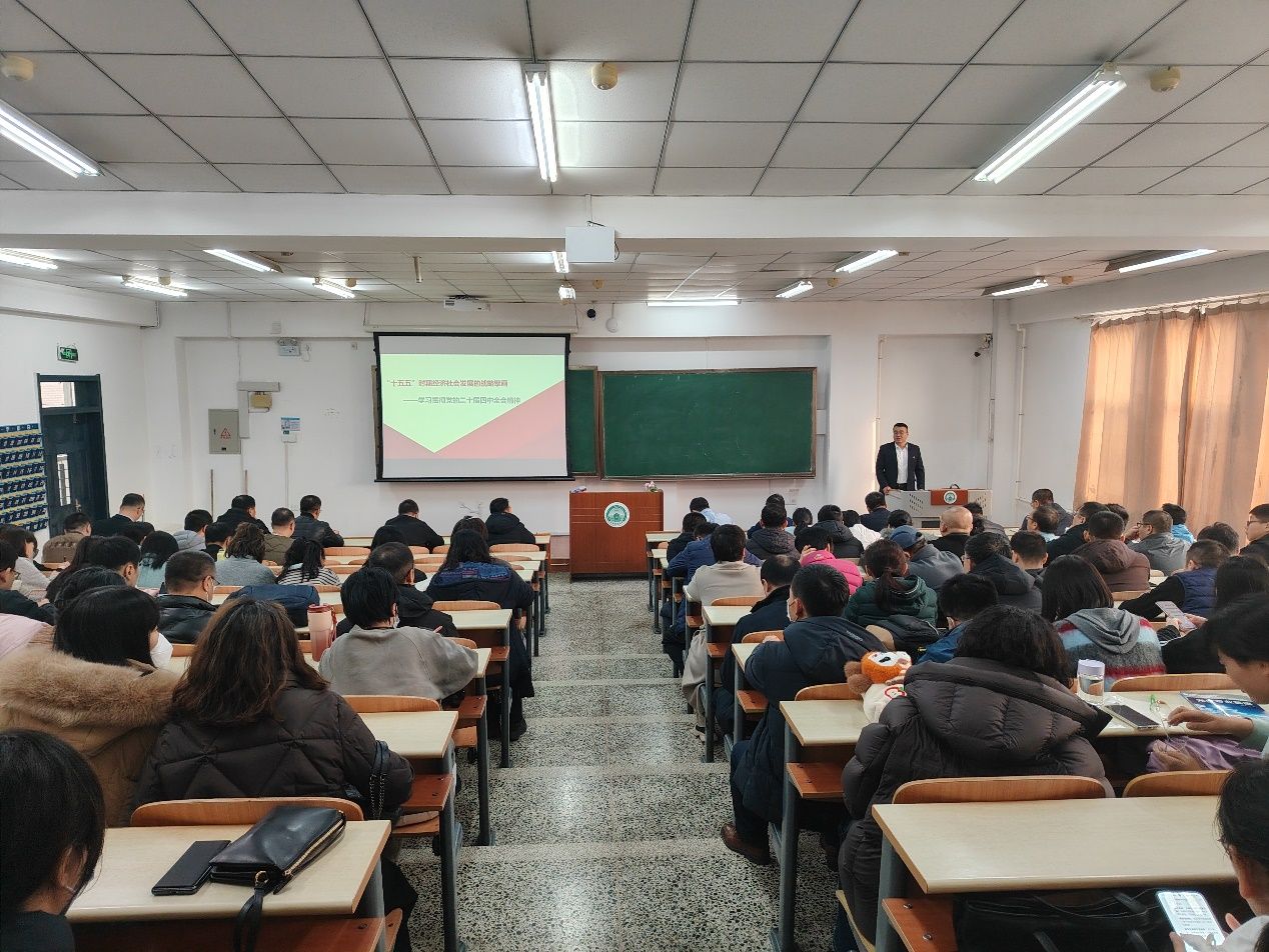为深入学习贯彻党的二十届四中全会精神,落实学校党委统一部署,理学院党委、外国语学院党委于11月26日邀请学校宣讲团成员、马克思主义学院黄宝成老师在三教阶402作题为《“十五五”时期经济社会发展的战略擘画》专题宣讲会,外国语学院党委副书记杜伟主持会议,两个学院全体教师参与学习。