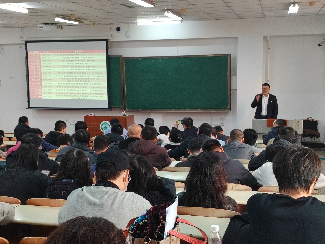 会上,黄宝成老师简要回顾了前十四个五年规划,讲解了“十四五”规划的重要成就。接着,黄老师紧紧围绕习近平总书记在党的二十届四中全会上的重要讲话和《中共中央关于制定国民经济和社会发展第十五个五年规划的建议》,详细阐述了“十五五”时期经济社会发展的战略地位、战略目标、战略原则、战略部署和战略保证,从宏观理论到微观阐释为与会教师进行详细解读。最后,黄老师建议全体教师以实际行动积极响应党的二十届四中全会号召:“全党全军全国各族人民要更加紧密地团结在以习近平同志为核心的党中央周围,为基本实现社会主义现代化而共同奋斗,不断开创以中国式现代化全面推进强国建设、民族复兴伟业新局面。”